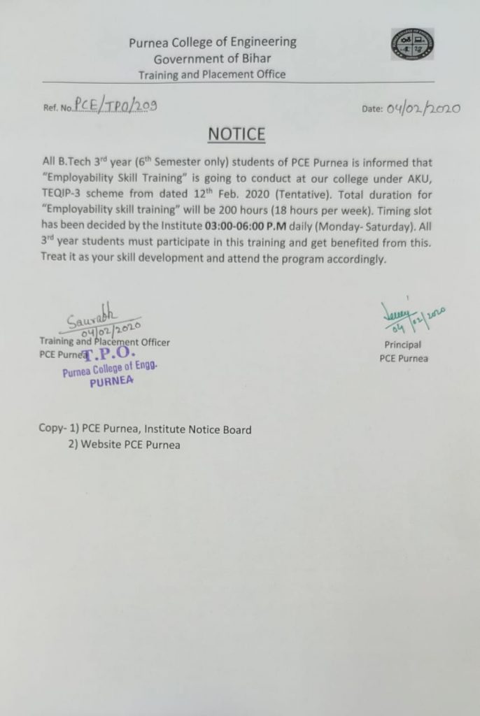 Regarding Employability Skill Training for B.Tech 3rd year students at PCE Purnea under AKU TEQIP-3 Scheme