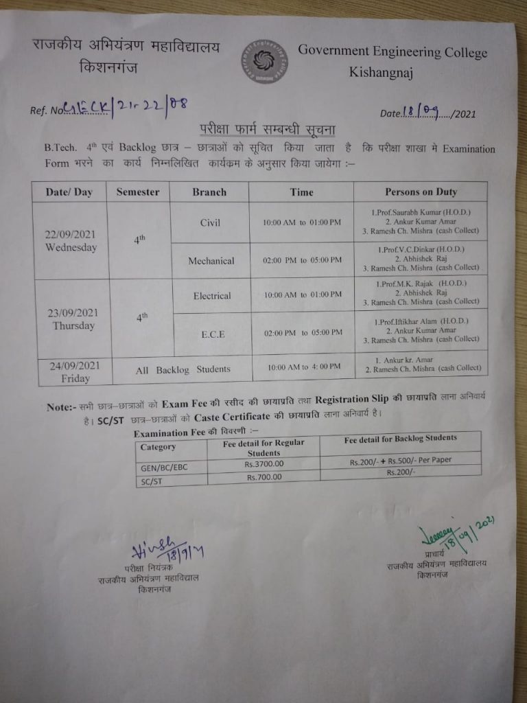 Regarding B.Tech 4th Semester Examination form + Backlog Papers : GEC Kishanganj
